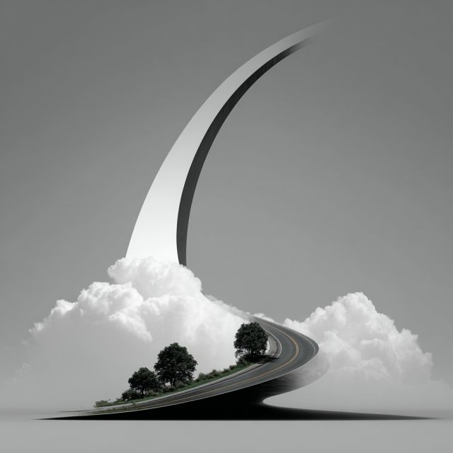 The essence of a dream is masterfully encapsulated in this surreal depiction of St. Louis’s iconic Gateway Arch. Towering gracefully into a seemingly boundless sky, the arch is transformed into a soaring ribbon of silver that sweeps across the horizon. A winding road, bordered by verdant trees, beckons the viewer into a journey of infinite possibilities, coiling around the base of the arch and extending into the clouds above. This montage art piece captures the tranquility and aspiration of the arch, set against fluffy, cotton-like clouds that radiate in a brilliant exposition of light and shade. Gaze upon this image and feel the pull of adventure and the serene promise of the open road that lies beneath this formidable monument. The stark contrast between the monochromatic tones of the arch and the vibrant blues of the sky creates a visual dialogue between reality and imagination—a gateway not just to a city, but to the mind's unexplored territories.