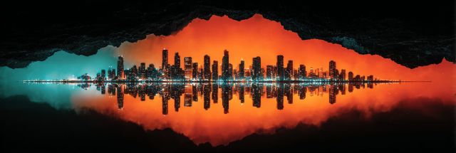 Immerse yourself in a breathtaking visual voyage with this stunning depiction of an urban skyline, framed within the natural contours of a mysterious cave. As the fiery hues of a twilight sky bleed into the dark crevices of the cave, they reflect hauntingly on a tranquil water body below, creating a mesmerizing mirror image that doubles the spectacle. This artwork masterfully blends elements of nature’s ruggedness with the sleek, luminous lines of modern architecture, inviting viewers into a dual world where the chaos of city life meets the serenity of natural landscapes. Each glowing building seems to compete with the stars above, casting a spellbinding glow that dances on the water’s surface. The vibrantly contrasting colors are not just a feast for the eyes but evoke a deep, emotional resonance, suggesting the endless possibilities that arise when contrasting worlds collide. This piece not only captivates but also philosophically muses on the harmonious existence of nature and human innovation. It’s a visual narrative that encapsulates the spirit of exploration and the eternal allure of the unknown.