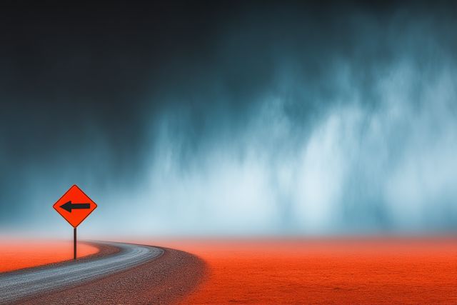 Imagine yourself standing at the edge of reality, where the mundane meets the mystical. A vivid turn sign punctuates an eerily quiet landscape, where a serpentine road slices through a pulsating, fiery terrain. The scene, bathed in a surreal blend of warm reds and cool blues, compels a blend of awe and uncertainty. This is no ordinary path; it's a visual metaphor laced with the thrill of adventure and the solitude of long journeys. The intense colors invoke a sense of urgency, while the enveloping mist adds a layer of mystery, hinting at the unknowns lurking beneath the surface of our decisions. The stark contrast between the earth's fiery crust and the ethereal blue mist is not just visually striking - it's emotionally stirring. It challenges the viewer to ponder the directions we choose and the paths we leave unexplored. This canvas is a beacon for dreamers, adventurers, and anyone who finds beauty in life's journey, no matter how treacherous the road ahead seems.