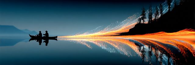 In the graceful calm of twilight, two kayakers glide effortlessly across a serene lake, their passage cutting through the glassy water and creating a symphony of shimmering ripples that play with the dying light. The horizon holds the last whispers of the day, where shadows intersect with sprawling beams of a teal and aqua embrace, enveloping the scene in an almost surreal tranquility. This artistic interplay of colors and reflection instills a moment of peace, transforming the mundane into the magical. The distant silhouette of the kayakers, set against the backdrop of a gentle sky, invites the viewer to pause and reflect on the quiet majesty of nature's canvas. The scene is a reminder of life's simple pleasures, of freedom found in nature's vastness, and of the pure joy that comes from immersing oneself completely in the moment. The 'dancing' drops of water, touched by the soft gaze of ambient light, further enhance the mood, adding a touch of vibrancy to the otherwise calm tableau. This artwork captures not just a visual spectacle but an emotional journey, evoking feelings of solitude, reflection, and tranquility.