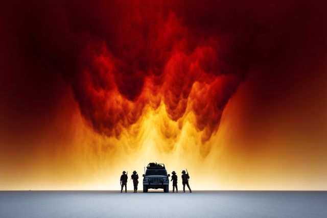In a world seemingly touched by the brushstrokes of an apocalyptic fervor, a canvas emerges to challenge the viewer's imagination and evoke profound emotions. Dominated by a fiery skyline that bleeds into a haunting red, the artwork depicts a gritty ensemble of figures and a robust vehicle poised in defiance against an incendiary backdrop. The sanguine clouds swirl into the sky in a dance that blurs the lines between reality and fantasy, symbolizing turmoil and resistance in the face of overwhelming odds. This evocative scene captures the essence of human resilience, standing steadfast amidst chaos, a theme that resonates deeply in the human spirit.