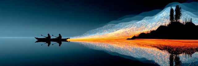 As dusk drapes the sky in a velvet blue, two kayakers glide across a mirrored water surface, beneath which lies a vast, unseen kingdom of aquatic life. This arresting canvas captures an ephemeral moment when the world above meets the world below in spectacular reflection. This isn't just a lake; it's a stage where light performs its quiet ballet, shimmering in fiery oranges and calming blues that stretch into infinity. The paddlers, small and agile, navigate this painting-like scene, their silhouettes small against the immense backdrop, emphasizing the sublime grandeur of nature. Here, the universe glimpses itself, and for a brief, shining moment, all elements conspire to craft a masterpiece of natural artistry. The fiery reflections mimic the celestial strokes of an otherworldly brush, painting the water with strokes of gold and azure. The mountains, distant yet discernible, guard the scene—a timeless sentinel overseeing this tranquil voyage. Above all, this canvas is a celebration of tranquility and the profound peace that comes from a simple paddle across a still lake under the watchful gaze of twilight stars. The experience is more than visual; it's a feeling that sinks softly into the soul, a reminder of the deep, resonant calm that nature can offer.