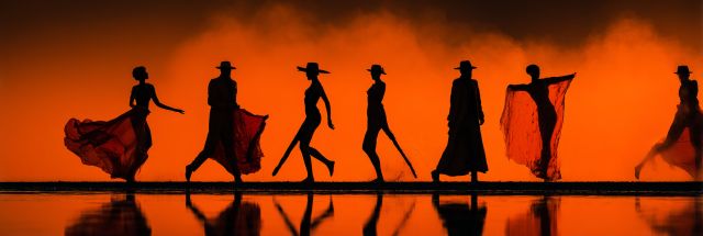 As the horizon melts into shades of ember, a line of dancers parades across a mirrored surface, echoing the fiery sky with their movements. Their silhouettes, defined sharply against the vibrant backdrop, capture a moment of fluid grace at the Burning Man Festival. Each figure, adorned in flowing fabrics and distinctive hats, portrays a unique blend of freedom and coordination. The dancers move rhythmically, their forms a blend of shadow and light, creating a dynamic tableau that feels almost otherworldly. This dramatic scene is not merely a dance but a celebration of human expression and connectivity set against the vast canvas of the desert. As the sun dips lower, their shadows stretch across the wetland, doubling the spectacle with their reflections—an interplay of color, movement, and texture that tantalizes the senses. The image invites viewers to immerse themselves in the festival's ethos of creativity and communal effervescence, portrayed through dance and costume, set against nature's sublime artwork. The rare beauty of the event transcends the photograph, suggesting stories and emotions woven into each movement. It’s an invitation to explore the boundaries of art and existence in one of the most unique cultural gatherings on the planet.