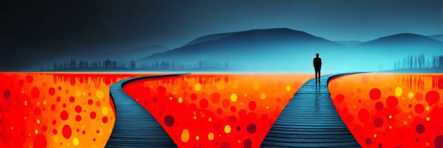 Immerse yourself in the vibrant contrasts of this extraordinary canvas art piece, where fiery hues of red and orange blend seamlessly into a tranquil blue night. In this awe-inspiring scene, a solitary figure stands poised on a narrow pathway, making their way across a fantastical landscape that challenges the very boundaries of reality. The scene conjures a fusion of warmth and mystery, guiding the viewer through a spectrum of emotions that echo the solemnity of the solitary traveler’s journey. The horizon stretches infinitely, brushed by ethereal mists under a deep, enigmatic sky. Each feature of this artwork, from the bubbling red-orange terrain mimicking a lava field to the serene, dark blue backdrop and silhouette of distant hills, weaves a story. This story, half dreamt in the quiet corners of the mind, invokes a dialogue between the inner world of human sensation and the outer realms of endless possibilities. Here, reality dips into the realms of surrealism, and nature melds with imagination, offering a perspective that both enchants and provokes profound contemplation.