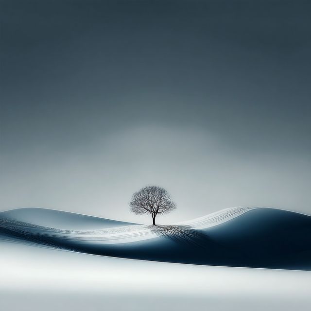 Enveloped in an ethereal blanket of snow, the scene unveils a solitary tree standing resiliently against a backdrop of sweeping snowy mounds, crafting a metaphoric dance between isolation and tranquility. As the ambient light washes over the landscape, it casts a sensual, almost liquid glow across the contours of the hills, magnifying the natural elegance of the setting. The stark contrast of the tree's bare branches against the soft, enveloping whiteness evokes a sense of quiet introspection and stirs the soul with its simplistic purity.