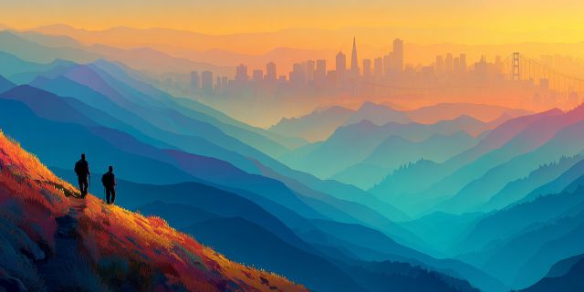 As the sun unveils its first blush upon the horizon, a spellbinding canvas is painted over San Francisco, viewed from a vantage far removed from its bustling streets. This remarkable piece captures two hikers enveloped in the serene embrace of nature, observing the awakening city amidst a cascade of colorful mountains. The juxtaposition is enchanting - the modern city skyline stands starkly against the fluid, organic forms of the rolling hills, bathed in gradients from deep blues to warm oranges. Each layer of the landscape contributes its own voice to this harmonic chorus of nature. Far above the cityscape, strands of golden light dance across the sky, reflecting off the iconic structures that shape the city's distinct profile. This piece, through its contrasting elements and vibrant color palette, evokes a sense of peace and perspective. It's a visual metaphor for balance—between mankind and nature, the elemental and the monumental, the hectic and the tranquil. This artwork invites the viewer to take a pause, breathe in the visual splendor, and wander into a realm of reflective tranquility.
