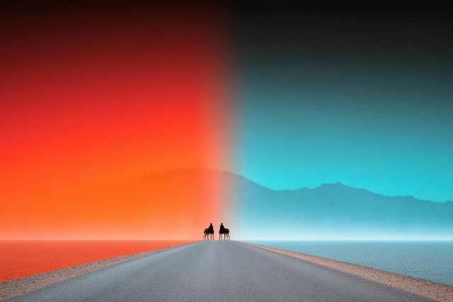 As the road stretches endlessly ahead, the horizon splits the world into two breathtaking realms—one bathed in a fiery red, the other in serene turquoise. These vivid clashing hues inspire a sense of adventure and mystery, reminiscent of the ethereal atmospheres of famed festivals like Burning Man, where reality feels altered and the ordinary transforms into the extraordinary. Imagine two riders, silhouetted against the advancing dawn, their journey a silent narrative set against nature's captivating canvas. The starkness of their figures adds a dramatic layer to the scene, enhancing the surreal quality of the image. Each color tone speaks its language; the red whispers tales of unbridled passion and daring escapades while the blue calms with whispers of tranquility and boundless openness. This visual symphony, harmoniously blending the extremes of warmth and coolness, invites the viewer into a mesmerizing contrast of emotions and possibilities. Here, in the unsaid and unseen, lies the true beauty of exploration—the bold lines, the smooth tarmac, the gentle lull of distant mountains resting under the sky’s colossal embrace. Such a landscape encourages one to linger, to ponder life's vast adventures, and to dream of paths waiting to be trodden.
