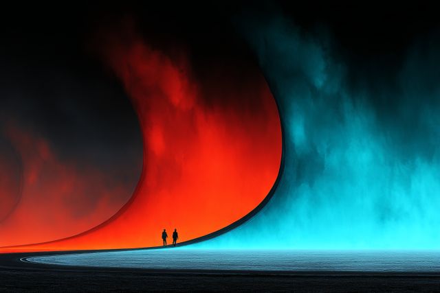 Cascading along an infinite horizon, the vibrant hues of red and blue curve into one another in a mesmerizing S shape, creating a surreal landscape that evokes the allure of distant, unknown worlds. This striking artwork seamlessly blends the mysteries of space with the tactile feel of a terrestrial path, inviting viewers into a journey that transcends the ordinary. As two silhouettes navigate this dreamlike route, the scene becomes a poetic reflection on life's journey and the universal quest for meaning amidst the cosmos' sublime beauty. The contrasting colors suggest a narrative of fiery passion interwoven with serenity and depth, emphasizing the emotional and psychological passages we embark upon throughout our lives. This piece, reminiscent of the exuberant creativity seen at festivals like Burning Man, uses its bold, graphic quality to pull the observer into a story about exploration, both external and internal. Each curve and color shift serves as a metaphor for life's ups and downs, with the serene blues offering calm and the intense reds igniting dynamism and action. As one gazes longer, the image starts to represent more than a mere pathway; it is a portal, a compact representation of life’s dualities and a beacon of hope and wonder in the vast universe.