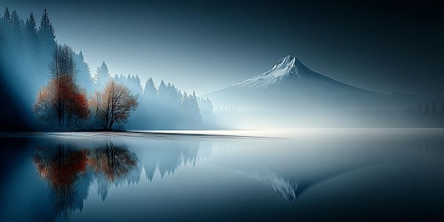 Dawn breaks over a picturesque Oregonian vista, where the tranquil waters of a serene lake mirror the awe-inspiring grandeur of Mount Hood. Snow-capped and majestic, the mountain rises in the distance, declaring its formidable presence over the dense forest that spreads across the horizon. These woods, whispering tales of the natural world's untouched beauty, are dappled in hues of emerald and olive, interspersed with the fiery oranges and reds of autumnal trees. The scene is bathed in a calm yet vibrant palette, where the azure sky melts seamlessly into the mirrored lake below, creating a perfect symmetry. This captivating display invites viewers to lose themselves in the depth of its tranquility and the purity of nature's artistry. The stillness of the lake and the crisp, clean air contribute to a palpable sense of peace, making every viewer pause and reflect on the beauty before them—both literal and metaphorical. As the light shifts, so does the mood of this enchanting landscape, reminding us of nature’s ever-changing yet constantly mesmerizing face.