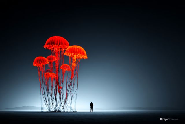 Under the enveloping cloak of night, a surreal scene unfolds where the ordinary dissolves into the extraordinary. At the heart of this vision, ethereal jellyfish, aglow with a vibrant, fiery hue of oranges and reds, tower over a solitary figure. These majestic creatures of light, reminiscent in form to the fantastical entities one might witness at the Burning Man festival, hover slightly above the ground, their tentacles trailing delicately. This striking juxtaposition ignites the imagination, suggesting an unearthly invasion peaceful in its approach, stark against the minimalist backdrop. The observer, dwarfed and undefined, stands as a silent witness to this otherworldly tableau. The interaction between human and fantasy highlights a narrative of curiosity and wonder, a dialogue between the mundane and the magical. The vast, empty horizon stretches beyond, tinted a deep, enigmatic blue that fades into the abyss of the unknown. This art piece invites viewers to linger in contemplation, to explore the boundaries of reality and the depths of their own perception.