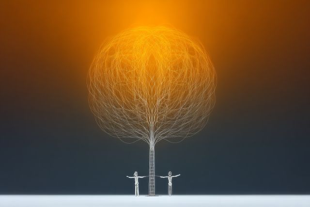 Enveloped in a serene backdrop, a radiant tree pulsates with a fiery luminescence, casting an otherworldly glow that falls gently upon the figures beneath its sprawling boughs. These silhouette figures—arms joyfully outstretched—seem to revel in the tree's warm embrace, their body language evoking a sense of liberation and wonder. The surrounding space is suffused with a gradient of twilight hues transitioning smoothly to the deep darkness that presses in from the margins, suggesting the liminal time between sunset and complete nightfall. This artwork brilliantly captures the magical interplay of light and darkness, crafting a scene that is both grounding and transcendent. The delicate, thread-like structure of the tree stands stark against the color-soaked sky, each glowing tendril appearing as though crafted from the very essence of light itself. This artwork is not just a visual treat; it's an invitation to ponder the simplicity and complexity of nature, the resilience of light, and the quiet strength emanating from standing still in a world constantly in motion.