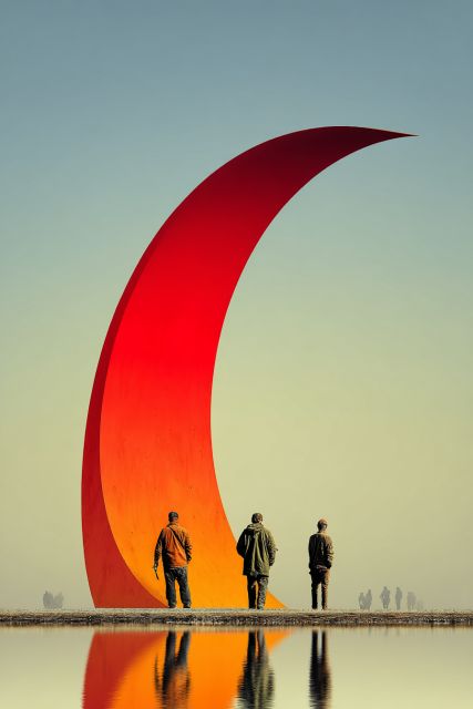In the quiet of dawn, a monumental crescent rises, its vibrant shade of red painting a stark arc against a tranquil sky. The sculpture—tall, bold, and undulating—mimics the ebullient leap of flames, yet possesses the serene permanency of a mountain ridge. Mirrored in a placid pool below, the crescent doubles its majesty, creating a full circle of introspection and infinite spectacle. This reflective pool plays its part masterfully, holding the world in its watery grasp, and adding depth to the fiery arc that slices through the crisp air.