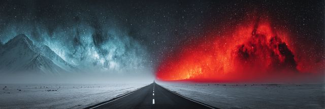 As if ripped from the pages of an epic novel, this stunning visual fuses the grandeur of icy mountains with the fervent glow of a fiery abyss, all united by a lone, stretching highway that invites the brave to venture into the beyond. This canvas not only captures a physical journey but also embodies a metaphorical voyage into the depths of our imaginations. On one side, a starlit sky dusted with the Milky Way sweeps over frost-covered peaks, symbolizing serenity and the untamed wilderness of nature’s coldest realms. On the opposite, an explosive eruption of red and orange simulates the chaotic beauty of a fiery hellscape, a stark contrast to the calm and composed ice. This artwork acts as a compelling visual dichotomy, portraying the elemental clash between fire and ice, tranquility and turmoil. It invites viewers to ponder their path, presenting the open road as a portal to contrasting destinies, each equally mesmerizing and intimidating.