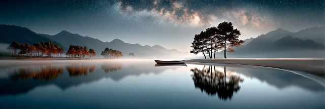 Under the bewitching cloak of night, a serene lakescape unfolds, mirroring the celestial wonders of a star-strewn sky. Bathed in the cool glow of moonlight, the still waters of the mountain lake become a canvas, reflecting the grandeur of the Milky Way as it whispers tales of the cosmos. On its banks, ancient pines stand as silent sentinels, shrouded in mist and echoing the tranquility of the untamed wilderness. The symphony of nature’s elements culminates in a perfect harmony, with distant hills rolling softly into the horizon, their contours highlighted by the gentle luminescence of moonbeams. Amidst these enchanting visuals, a solitary boat lies moored, adding a touch of human presence to this wild, dreamy landscape. As the night deepens, the air fills with the crisp scent of pine and the soft lapping of water against the shore, inviting viewers to pause and lose themselves in the scene’s ethereal beauty. This visual narrative not only captivates the eyes but also soothes the soul, making it a profound statement of nature’s quiet majesty and the peaceful solitude one can find under the starlit sky.