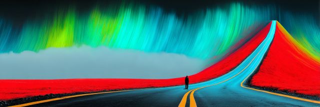 Enveloped in a tapestry of arresting colors, the landscape beckons viewers down an extraordinary curve of tarmac that splits a vibrant crimson field. The road, highlighted by a solitary, continuous yellow line, draws the eye toward a distant vanishing point, under a mesmerizing sky painted with strokes of green and blue auroras. This serene yet surreal scene captures the imagination, evoking a fusion of dream and reality reminiscent of the Burning Man festival aesthetic.