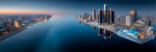 As the first light of Independence Day touches the Detroit Skyline, the city comes alive in hues of gold and blue. An ethereal glow bathes the iconic structures, mirroring the vibrant history and spirit of the city. The horizon bends gently, sloping into the calm waters that serve as a natural mirror, doubling the city’s majestic appearance. This panorama extends from the neoclassical majesty of the Guardian Building to the modern sleekness of the Renaissance Center. Observers can almost hear the serene hush over the river as the day begins, punctuated by distant echoes of celebration. This image, captured on a Fourth of July, does more than depict a city; it celebrates resilience and beauty, combining high-definition textures with a masterful composition to evoke a deep sense of pride and wonder. Each building tells a story, reflected with clarity against the backdrop of a clear morning sky, promising a day filled with festivity and reflection.