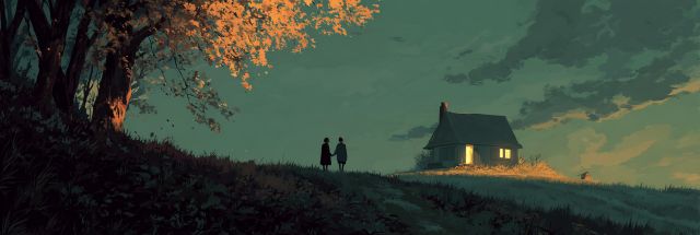 As dusk unfurls its cloak over the landscape, a rustic home radiates warmth against the encroaching coolness of twilight. The subtle glow from inside the house casts a welcoming light through its windows, promising a cozy haven amidst the chill of the evening air. Around the dwelling, trees dressed in the fiery colors of autumn whisper tales of the changing seasons, their leaves flickering in the gentle breeze like flames under the waning light. In the foreground, a couple walks hand-in-hand, their silhouettes rendered almost spectral under the ethereal sky, moving slowly towards the house. Their journey along the path, framed by nature's vibrant palette, speaks of quiet contentment and shared solitude. This vibrant canvas invites the viewer to ponder moments of peace and personal reflection, capturing a snapshot of life's simple pleasures amidst the grand tapestry of nature.