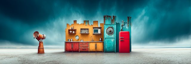 Against an expansive desert backdrop, under a brewing storm, a composition both surreal and captivating emerges—a kitchen unlike any other. Colored in striking hues of orange, turquoise, and red, this fantastical arrangement beckons the viewer into a world where the mundane transforms into the extraordinary. A cornucopia of retro appliances, mismatched wooden cabinets, and quirky decor items are meticulously curated to evoke the eclectic essence of the Burning Man festival. This image marries the stillness of a barren landscape with the vibrancy of festival culture, creating a paradox that teases the imagination. A vintage refrigerator, vibrant and glossy in cherry red, stands proudly beside a weathered turquoise washing machine, their bright colors a stark contrast to the muted tones of the desert floor. Overhead, dark, ominous clouds loom, suggesting an impending storm that adds drama and a touch of foreboding to the scene. This artwork doesn't just depict a space but narrates a story woven through the very fabric of creativity and freedom—a tale of a place where art and life merge under the open sky. Each element, from the rustic pipes and valves to the whimsical positioning of a solitary telescope, is a testament to ingenuity and artistic vision—a glimpse into a world where every object holds meaning and contributes to a narrative larger than itself.