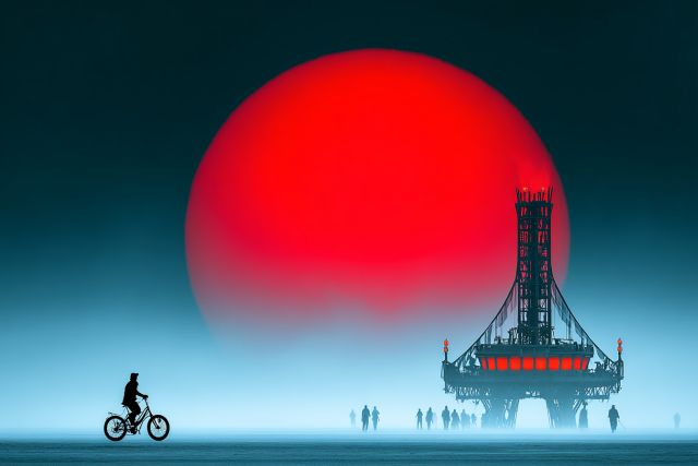 *** About Burning Man: Burning Man is an annual event that transcends traditional festival norms and is held in the Black Rock Desert of Nevada. This gathering is characterized by community, art, self-expression, and self-reliance. Attendees from across the globe convene to create a temporary city, immersed in creativity and inclusive social interaction. The event is deeply influenced by ten principles including radical inclusion, gifting, decommodification, radical self-reliance, and radical self-expression, which shape the communal ethos. The imagery often associated with Burning Man includes large, provocative art installations and performances set against a stark, arid backdrop—echoes of which are vividly captured in this image.