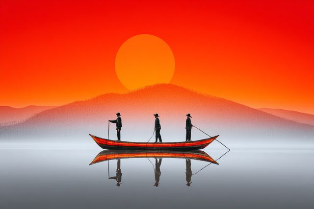 As the sun casts its first golden rays, a gentle mist rises off a placid lake, creating a canvas where nature and tranquility blend seamlessly. In this stirring scene, three figures stand poised in a slender, elegantly curved boat, their silhouettes sharply outlined against the vibrant, fiery backdrop of a rising sun. The simplicity of the subjects, contrasted with the dramatic expanse of color ranging from deep orange to crimson red, evokes a sense of peace and introspection. Reflections on the water's surface mirror the calmness of the sky, enhancing the surreal quality of this serene moment. This portrayal is not merely of a daybreak but a metaphorical awakening, inviting observers to pause and reflect on the quiet beauty of fleeting moments. The mountainous silhouette in the distance underlies the vastness of the scenery, adding a layer of depth and mystery to the composition. It is an artwork that speaks to the soul’s yearning for moments of peace and the inherent beauty in simple, silent observations.