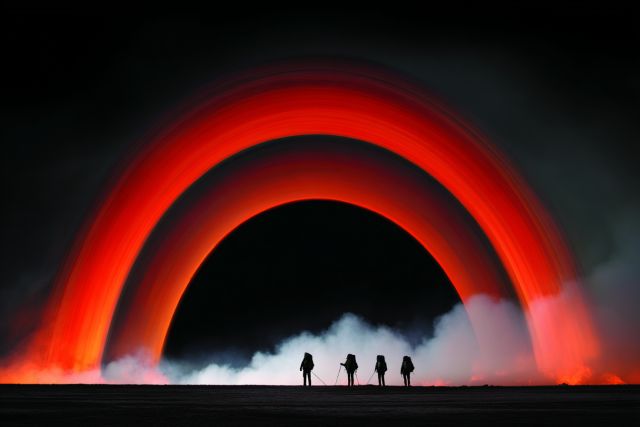 Imagine standing under the boundless night sky, where the vast desert floor meets a flaming arch illuminating the horizons with its ominous yet enthralling red glow. This artwork, set against the dramatic backdrop of the Eye of the Sahara, captures an almost surreal convergence of nature and visual metaphor. The silhouettes of adventurers, minuscule against the stunning expanse, evoke a sense of exploration and wonder. Each figure, poised with a camera, seems caught between the roles of observer and participant, documenting an event that transcends the ordinary. This fusion of the natural world and a fiery spectacle blends the familiar with the fantastical, pulling viewers into a narrative brimming with mystery and allure. The vivid red arch, swirling like a portal to another dimension, contrasts dramatically with the serene blues and grays of night, painting a scene straight out of an epic tale. This is not merely a visual experience, but a journey into the heart of the uncanny, where the Earth itself seems to reveal hidden stories in a language of color and light.