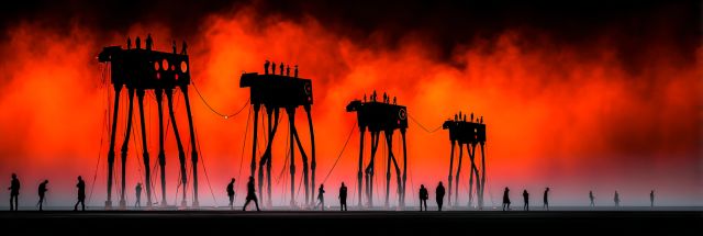 As dusk descends upon the horizon, a spellbinding vision unfolds against a backdrop of a deep, fiery crimson. In this visually arresting artwork, the world appears suspended between fantasy and reality, where ethereal, towering structures stride across the landscape on slender, elongated legs. Each silhouette, a surreal giant against the blazing sky, carries a cluster of figures, their presence adding a touch of humanity to the otherworldly scene. The imagery, reminiscent of the artistic flair seen at the Burning Man festival, ignites the imagination with its blend of dystopian futurism and tribal communal spirit. The vivid crimson and orange hues bleed into one another, creating a canvas that pulsates with life and energy. This stirring tableau not only captures the essence of collective exploration but also echoes the indomitable human spirit's quest for meaning in the vast, often unfathomable tapestry of existence. Shadowy human figures traverse the foreground, their forms small yet resonant against the grand spectacle, suggesting a narrative of journey and discovery. This artwork, a masterpiece of contrasts and emotions, invites viewers to lose themselves in its depths, to explore the nuanced interplay of light, shadow, and color, and to ponder the profound connections between man, machine, and the elemental forces of nature.