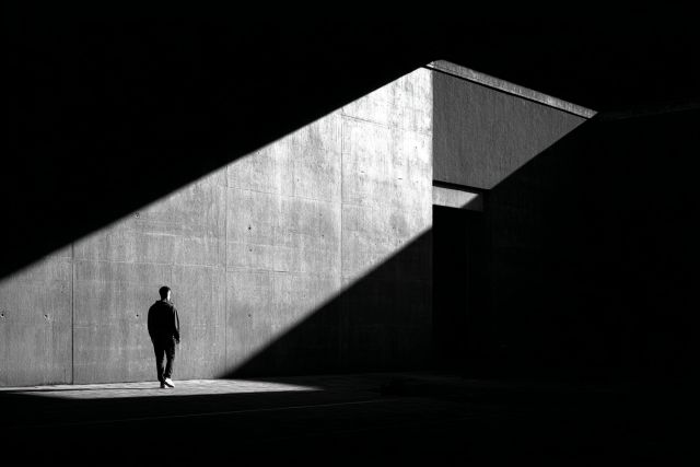 Solitary Figure under Sharp Light Rays Amidst Urban Silence