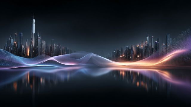 Amid the tranquil darkness of the night, the vibrant essence of San Francisco's skyline emerges as a digital dreamscape. In this artistic representation, the city's iconic architectural silhouettes blend seamlessly with a visionary flow of cybernetic particles. Elegantly arrayed skyscrapers stretch towards the heavens, their forms ethereal and softly illuminated by a dance of neon blue and violet hues. This mesmerizing scene reflects a futuristic interpretation of the city, where the tangible meshes with the digital, creating an almost otherworldly atmosphere. The composition is dominated by a smooth, flowing wave of glowing dots, suggesting a dynamic yet serene movement through this urban fantasy. The reflections in the water below mirror this celestial display, doubling the city’s luminosity and enhancing the overall serenity. The artwork captures the essence of volumetric light; the beams appear tangible, capable of both illuminating the night and casting alluring reflections across the water's surface. It is an invitation to pause and reflect, not just on the scene, but also on the boundless possibilities of future cities. Wrapped in a cinematic wide-angle view, this calm ambient lighting not only highlights the city’s sophisticated elegance but also enshrines the night in a soft, enchanting glow, casting each viewer as a solitary wanderer in a digital reverie.