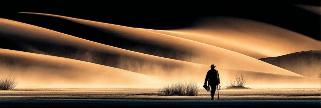 Bathed in the golden hues of a relentless sun, the landscape stretches out - an ocean of sand shaped by the winds into elegant yet stark waves of dunes. Here, amidst this desolate beauty, strides a solitary figure, small against the vastness, yet undeniably significant. Each step is an attestation to the resilience required to traverse such harsh terrain, where the wind whispers secrets of old into the ears of those daring enough to listen. The contrast between the deep shadows cast by the dunes and the blindingly bright sand creates a canvas that speaks of timelessness and transient moments simultaneously.