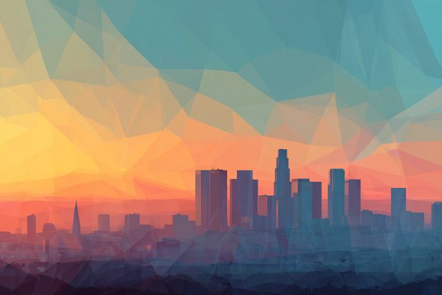Beneath a breathtaking spread of golden and amber hues lies a geometric abstraction that introduces the viewer to Los Angeles's iconic skyline through the lens of origami-inspired artistry. The composition melds sharp, angular shapes that mimic folded paper, with the soft backlighting of a setting sun enveloping the city in a warm glow. This piece isn’t just about replicating a cityscape; rather, it’s an artistic whisper of urban evolution, reflecting the angular complexities of city life and the serene moments that pierce through the bustling city noise. The gradient of blues to fiery oranges suggests not just the time of day but the constant transformation inherent to metropolitan areas. Each building, while seemingly simple in form, stands complex in its significance, possibly echoing the narratives and countless stories unfolding within. Here in this crafted scene, the minimalist approach doesn't simplify the city; it elevates it, making each line and shade a stanza in a poetic homage to Los Angeles. This artwork carries more than aesthetic appeal; it is an invitation to ponder the symbiotic relationship between nature's vast canvases and human architectural achievements.