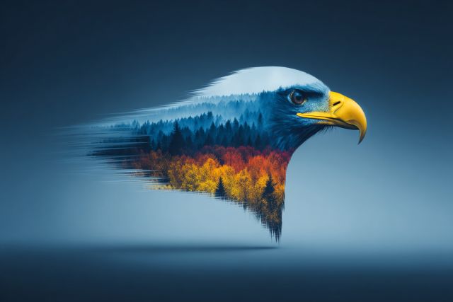 Immerse yourself in the profound beauty of a golden eagle soaring over a spectacular autumn landscape with this exquisite double exposure artwork. Here, artistry and nature intertwine to create a visual hymn to wilderness and wildlife. The sharp, vivid gaze of the golden eagle, symmetrical and commanding, captures the essence of freedom and power. This majestic bird, a symbol of strength across cultures, is seamlessly blended with a vibrant forest dressed in autumn's finest hues—burning oranges, deep reds, and golden yellows. These warm colors contrast dramatically with the cool, misty blues of the eagle’s feathers and the gentle shades of the distant mountains and skies. This artwork invites viewers to ponder the eagle's wild spirit and the serene beauty of the untamed forests. Each brushstroke and pixel vibrates with life, suggesting the rustling of leaves and the crisp mountain air, pulling the observer into a peaceful reverie of natural splendor.