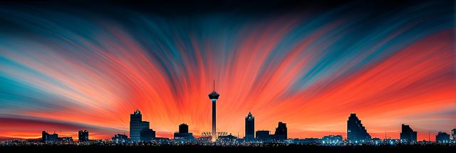 An electrifying panorama, this depiction of the San Antonio skyline resonates with a spectacular and surreal energy, reminiscent of the famed Burning Man festival. The artwork stretches across the canvas in an explosion of fierce orange and red hues, bleeding into a gradient of deep blues and ominous blacks, symbolizing the passage from day into night. The iconic Tower of the Americas stands triumphant, a sentinel amidst the luminous glow of city lights beneath it. This creative interpretation not only captures the architectural essence of San Antonio but also infuses it with a bold, artistic flare that mimics the unpredictable spirit of Burning Man. As the skyline silhouettes against the fiery tapestry, the image invites viewers to contemplate the dynamic juxtaposition between urban civilization and wild, artistic rebellion. Each building seems to pulsate with life, reflecting the city's bustling activity, while the outspread rays suggest a cosmic explosion of ideas and creativity, perhaps an homage to the city's burgeoning art scene and vibrant culture.