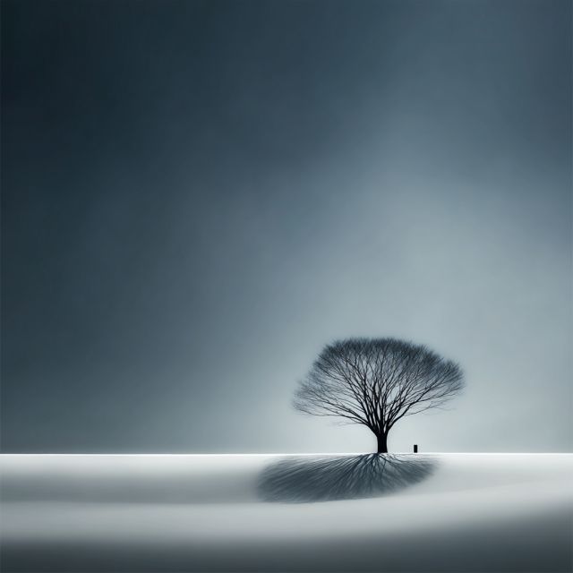 Captured in an almost surreal monochrome landscape, this artwork presents a solitary tree standing defiant against a vast, empty horizon. The tree, bare of leaves, stretches its branches towards the sky as if in silent supplication or in a quiet celebration of its solitude. The contrast between the dark silhouette of the tree and the stark, luminescent whiteness of the snow-clad ground evokes a sense of calm and introspection. This ethereal scene is punctuated only by a tiny black figure standing at a considerable distance from the tree, adding scale and a poignant touch of humanity to the composition. The smooth gradient of the sky, merging imperceptibly from a deep near-black to a lighter gray, seems almost to echo the sound of silence. Each detail of the tree’s intricate branches is rendered with meticulous care, standing stark against the lightness, their reflections faintly mirrored on the surface beneath. This image invites viewers to pause and reflect, offering a visual metaphor for solitude, resilience, and the enduring beauty of nature's minimalistic expressions.