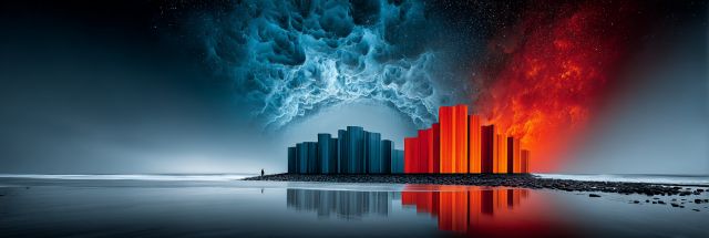 Amid a surreal panorama, fiery orange and icy blue hues bleed into each other with dramatic intensity. The scene sets an epic stage where an unlikely skyline rises boldly against a backdrop of a turbulent celestial tempest. This artwork, inspired by the Giant's Causeway of Northern Ireland, morphs into a vivid metaphor through the lens of a Burning Man-esque fantasy. Imagine a cityscape where the rigid architectural forms—sharp, elongated structures in saturated reds—seem both alien and familiar. They reflect poignantly on the mirror-like surface beneath, casting an eerie symmetry between reality and its darker, flipped twin. Above, an otherworldly storm thrashes with electric life; clusters of cosmic energy swirling in deep blues and whites, suggesting a universe roiling with dynamic turmoil. Obscured in the heart of this electric maelstrom stands a lone figure, perhaps reflecting on the profound serenity found on the edge of chaos. Each element of this fantastical composition—fire and ice, light and shadow, stillness and storm—crafts a narrative of cosmic awe and earthly resilience, urging viewers to delve into interpretations as contrasting and powerful as the hues that define them.