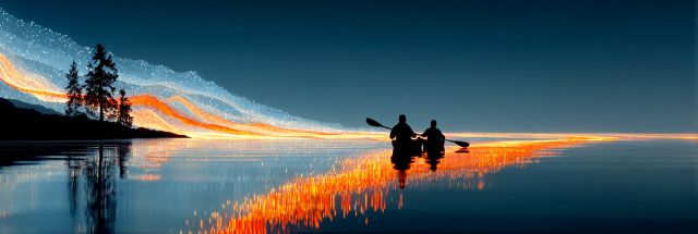 As twilight casts its tranquil spell, two adventurous souls take to the serene expanse of water in their kayaks, moving fluidly as silhouettes against the fading light. The horizon bends in a symphony of fiery orange and deep teal hues, painting the scene with the vibrant strokes of sunset and dusk intertwined. This breathtaking tableau unfolds beneath an expansive sky transitioning from day to night, captured in a mesmerizing blend of reality and reflection. The placid surface of the water mirrors this spectacle, interrupted only by the rhythmic dipping of the kayakers’ paddles. Each splash sends ripples across the liquid tapestry, distorting the burnished light and drawing the eye to the fluid dynamics at play. The scene is enchanting, inviting viewers to linger in the moment between two worlds—a vivid reminder of nature’s quiet grandeur and the humble thrill of exploring it. Above, the echoes of the day's warmth fade into the cool whispers of approaching night, setting the stage for a journey under the stars. This image is not just a showcase of nature's beauty but a celebration of quiet exploration and the reflective pause it brings to our bustling lives.