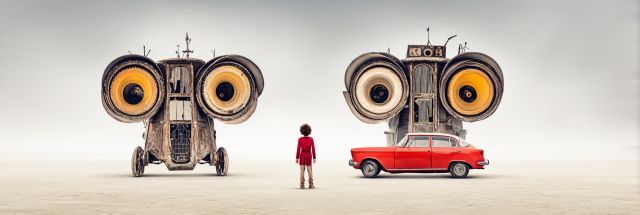In an infinite stretch of bleached desert, a scene unfolds that captivates the imagination and tickles the whimsical. At the heart of this visual tale, a small child in a vivid red dress stands, a stark contrast against the expansive, muted backdrop. Their gaze locks onto a curious assembly that feels both out of place and perfectly set within this sandy stage: a monstrous, anthropomorphic structure composed of salvaged parts, resembling a robot with giant speakers as its face. Nearby, a classic red car seems to await a journey, its bright hue echoing the child's attire, suggesting an unspoken connection between human, machine, and the journey they are about to embark on.
