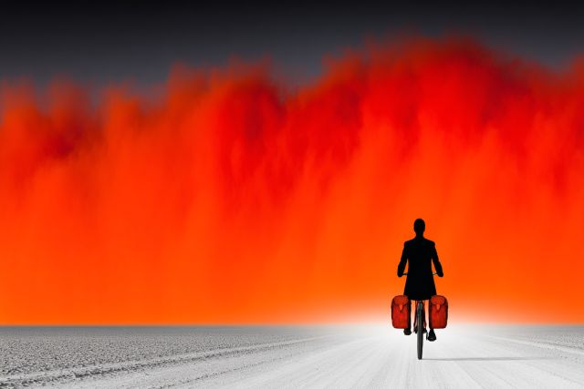 As viewers, we are immediately drawn into a surreal landscape depicted in this art piece, where the stark, monochrome road starkly contrasts with the fiery orange and red sky that seems to originate from another dimension. A lone traveler, silhouetted against this apocalyptic backdrop, pedals a bicycle equipped with panniers, suggestive of a long journey or an escape towards or from the unknown. This image, layered with rich colors and profound simplicity, evokes a sense of adventure, mystery, and resilience in the face of overwhelming circumstances.