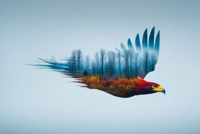 Majestic Flight Over Autumnal Woods: The Art of Nature Merged