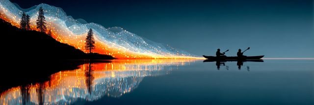 As twilight deepens, a serene lakeside becomes the stage for a breathtaking spectacle of nature fused with a touch of human endeavor. Two kayakers, silhouetted against a mirror-like water surface, paddle gently through the tranquil scene. This stunning canvas captures the moment under a glittering sky, where the Milky Way appears to dip its toes into the still waters. The horizon is alive with an orange glow, hinting at a setting sun or perhaps the distant lights of a sleepy shoreline town. The gentle ripples in the water reflect the celestial dance above, creating a symphony of light and movement that feels both ephemeral and eternal. This artwork transports the viewer to a moment of sublime beauty, where the vastness of the universe meets the quiet pursuits of humanity. It speaks to the adventurous spirit within all, a reminder of the peaceful coexistence with our magnificent world.