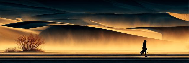 As the day edges towards its end, the world transforms under the alchemy of the golden hour. Within this breathtaking canvas, nature and the human spirit converge in a dance of shadows and light. Sweeping sand dunes undulate across the landscape, each peak and valley crafted by the relentless whispers of the wind. The dunes glow warmly, basking in the golden sunlight that filters through a dusty haze, lending an almost otherworldly quality to the scene.