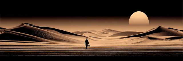 Bathed in the warm glow of the descending sun, the image unfolds a mesmerizing scene of a vast desert landscape. The skyline is dramatically punctuated by a large, low-hanging sun that casts an ethereal light across the sculpted sand dunes, each ridge meticulously drawn out by nature's unseen hand. In the foreground, the silhouette of a lone wanderer traverses the seemingly endless sands, his figure small yet poignant against the grandeur of the desert’s golden canvas. This imagery not only evokes a sense of isolation and the sheer scale of nature's vastness but also inspires awe at the rugged beauty and resilience represented by the solitary figure's path. The profound shadows that stretch long across the ridges play with perspective, making the sun’s farewell dance a spectacle of light and darkness. This visually stirring landscape invites onlookers into a contemplative narrative, suggesting themes of endurance, solitude, and the subtle interplay between humankind and the formidable natural world around us.