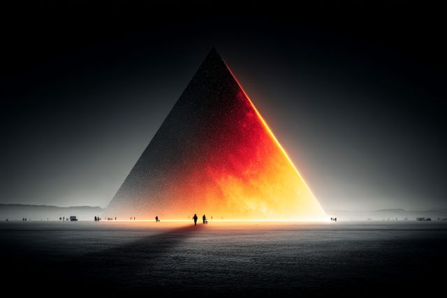 Under the enigmatic expanse of a hushed horizon, an awe-inspiring pyramid emerges, draped in a cloak of iridescent lights and profound shadows. This masterpiece artfully juxtaposes the solidity of geometric precision with the ephemeral nature of light. As an ethereal glow divides it, one half of the pyramid bathes in a vibrant fire-like orange, while the other remains shrouded in a mystical, inky darkness. This striking interplay of colors suggests not just contrast but a profound unity - capturing a moment of cosmic order amidst chaotic silence. Around the base, silhouetted figures stand witness to this surreal spectacle, their presence adding a human element to the otherwise otherworldly scene. This visual symphony extends into the limitless backdrop, where a subtle gradient of light hints at the infinite. Every aspect of this artwork echoes a deep resonance with themes of human contemplation within the universe, provoking in its viewers a reflection on their place in a grander scheme. Such a piece not only decorates a space but transforms it, inviting those who gaze upon it to tread the fine line between reality and the imagination.