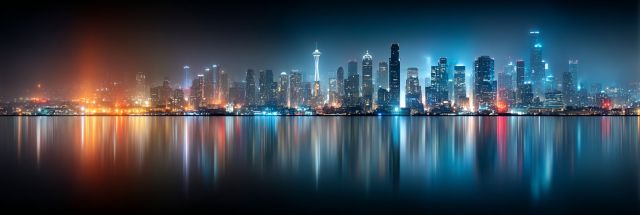 As dusk falls on the Fourth of July, Washington's skyline bursts into a symphony of lights, etched against a velvety blue sky. The vibrant tableau stretches across the canvas, capturing a moment of glory and pride with every building aglow. The iconic Space Needle stands tall, a sentinel watching over the city, clad in an aura of radiant light that mirrors the festive spirit below. This panorama is more than a visual feast; it's a narrative woven with the golden threads of illumination that dance across the reflective waters, doubling the city's brilliance.