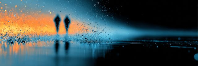Dance of the Water Droplets Amid Fiery Sunset and Silhouetted Joggers