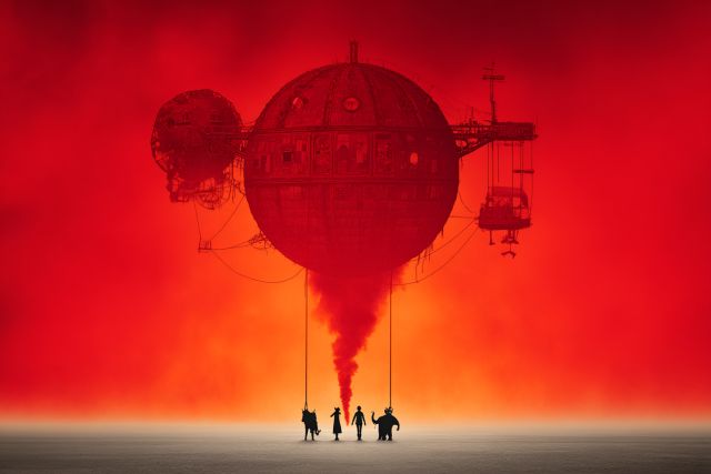 Enveloped in a dramatic crimson hue, this canvas features an otherworldly scene that captivates and intrigues. At the center, an immense balloon crafted with intricate detail floats ominously above a desolate landscape. Emitting a deep red plume that colors the sky, the balloon's mysterious aura is both foreboding and enchanting. Below, silhouettes of adventurers—a pair on foot and one on a camel—move towards this surreal floating behemoth, adding a poignant human element to the spectral tableau. This image, reminiscent of the fantastical escapades found in dreams, is a gateway into a narrative ripe with the themes of exploration and the unknown. The stark contrast between the red sky and the shadowed figures evokes a feeling of solitude and introspective journeying, inviting the viewer to contemplate the labyrinth of their subconscious. The artistic style, possibly inspired by the visionary landscapes seen at events like Burning Man, utilizes color and proportion to warp perception and challenge reality. Perfect for those who appreciate art that doubles as a portal to other dimensions and possibilities, this piece tells a story of courage in the face of the surreal and uncharted.