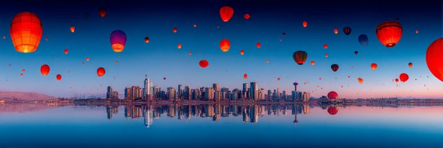 Bathed in the ethereal glow of the morning, the Calgary skyline emerges as a striking juxtaposition against a tapestry of vibrant, floating lanterns. As the city awakens, these orbs of light dance delicately in the cool air, each one a fiery vessel carrying whispers and dreams towards the heavens. The panorama spreads magnificently, reflecting its luminous spectacle on the serene waters below, doubling the city’s allure with a flawless mirror image. This surrealistic portrayal infuses elements from the iconic Burning Man festival, blending fantastical jellyfish-style lanterns with urban architectural elegance. The scene is a celebration of human creativity and natural beauty, a reminder of the peaceful coexistence between man-made environments and whimsical artistic expressions. Each lantern, with its own unique color and warmth, adds a rhythmic harmony to the landscape, crafting a visual symphony that beckons viewers to dream, to wander, and to escape into a realm where fantasy swirls around the concrete bones of urban life.
