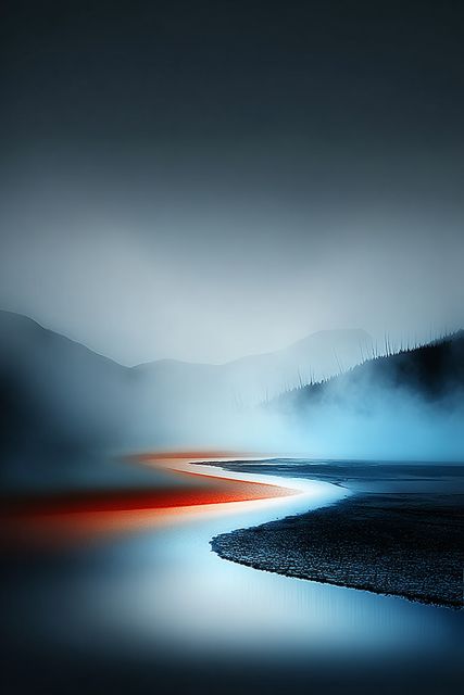 Enveloped in the soft whispers of dawn, Yellowstone National Park transforms into a mystical landscape, captured beautifully in this stunning canvas art. As the first light of day touches the serene waters and the undulating terrain, a spectacle of vibrant orange and deep blue hues paints the scene, evoking a silent yet powerful dialogue between earth and sky. The gentle mist, rising from the warm geothermal waters, dances over the river, adding a dreamlike quality to the quiet morning. This artwork meticulously portrays the contrasting textures of the rugged riverbank against the smooth, reflective water, inviting the viewer to contemplate nature's delicate balance. The distant hills, shrouded in a veil of fog, stand as silent sentinels over this tranquil vista. This piece is not merely an image; it is an intimate moment of connection with nature’s untouched beauty, emphasizing the profound calm and the revitalizing energy of dawn at Yellowstone.