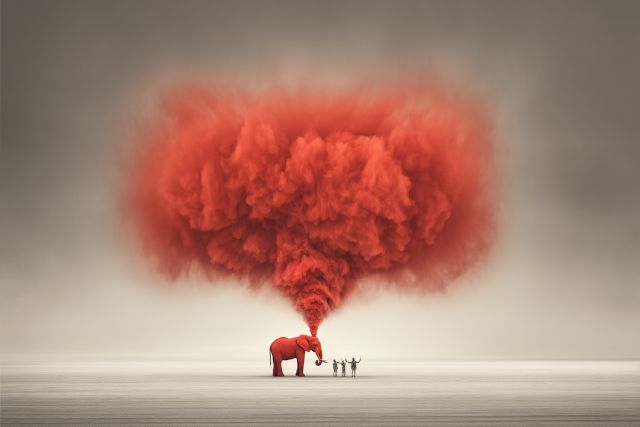 Amidst an expansive, flat horizon where the sky meets the stark, seemingly endless ground, an extraordinary vision springs to life. A solitary red elephant, vibrant against the muted earth tones, stands as the centerpiece of this enigmatic tableau. From its trunk, a spectacular, voluminous cloud of crimson smoke billows forth, engulfing the air in a faucet of colors that seem to pulse with vibrant life. This arresting image merges the familiar with the surreal, challenging the viewer to interpret its myriad of potential narratives. What story does the elephant tell? Is this a serene display of natural power, or a symbolic release of energy and transformation? The red intensity of the smoke might suggest fervor and passion, yet its graceful ascent into the calm expanse hints at a peaceful transition or awakening. This artwork is an invitation to lose oneself in contemplation, to delve into a scene that transcends the ordinary and ventures into the realms of fantasy and dream.