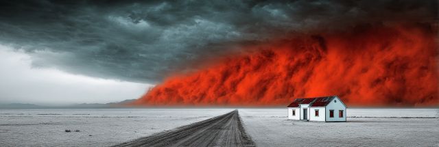 Against an expansive horizon, where the earth whispers untold stories, a striking scene unfolds—a desolate road stretching towards two lone structures under an ominously fiery sky. This masterpiece, painted with a brooding palette, captures a surreal moment where nature and humankind's creations converge in a poignant tableau. The stark contrast between the vivid, scorching red sky and the calm grey of the barren landscape evokes deep, contemplative thoughts about isolation and resilience in face of unseen challenges. The road acts as a guide, drawing viewers deeper into the composition, and towards the small, stark white houses that stand defiantly under the wrath of the heavens. As if from a dream or a distant memory, this image encapsulates the beautiful terror of nature and the quiet dignity of solitude. One can nearly feel the chill in the air, smell the impending storm, and hear a silent howl sweeping across the flatlands. This artwork masterfully blurs the lines between photography and painting, creating a visual feast that stirs the soul and challenges the spirit.
