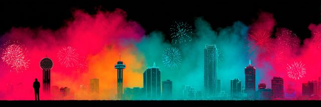 Enveloped in a kaleidoscope of vibrant colors, the Dallas skyline emerges as a rhythmic silhouette against the night sky, alive with the bursting fireworks overhead. A lone figure stands in awe, their presence reflecting the spirit of every onlooker who finds themselves captivated by this display. This artwork ingeniously blends the architectural elegance of Dallas with the untamed joy and excitement of a festival seemingly inspired by the ethos of Burning Man—a celebration of human artistry and communal effort. Each building, iconic in its right, stands highlighted by the vivid, neon hues that sweep the horizon in shocks of pink, blue, and green, evoking the electric energy of a city renowned for its dynamic culture and powerful skyline. Fireworks mimic the sparkling stars of Texas' vast skies, each burst adding a layer of drama and celebration to the scene. The art piece not only captures the essence of this metropolis but also pulses with the lifeblood of its vibrant night festivities, making it an enchanting visual story of urban excitement and festive wonder.